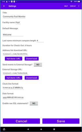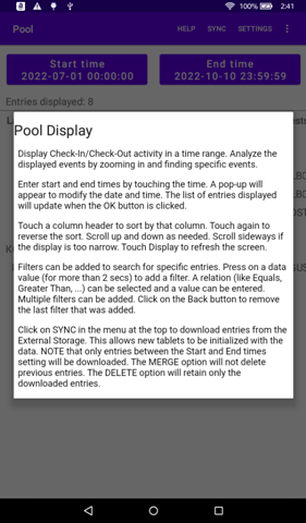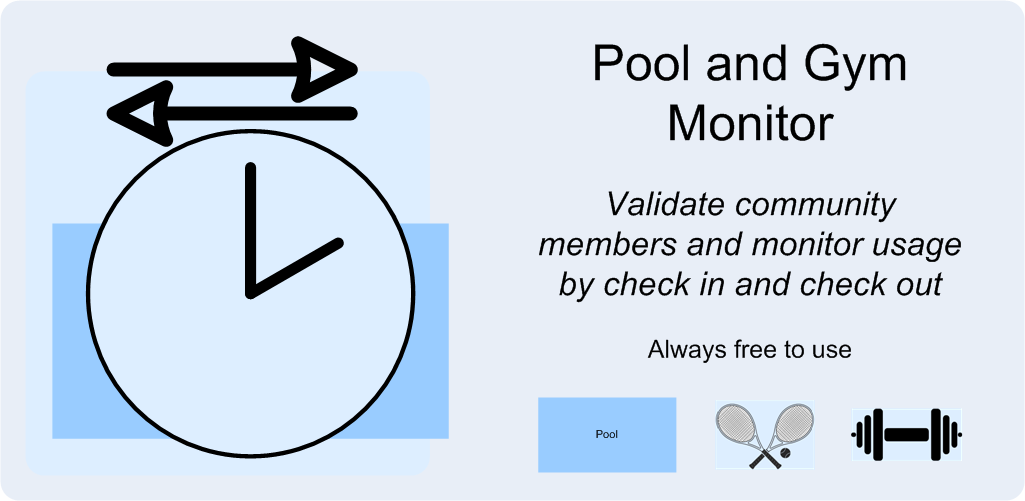 The Pool Monitor is a free app that can validate community members who use a shared facility, like a swimming pool or a gym. Members can 'check in' and 'check out' to the facility. The app has two main goals: validate authorized members and record the usage of the facility. A number of useful statistics can also be extracted from the recorded data. Pool can be installed from here: Pool.apk.
