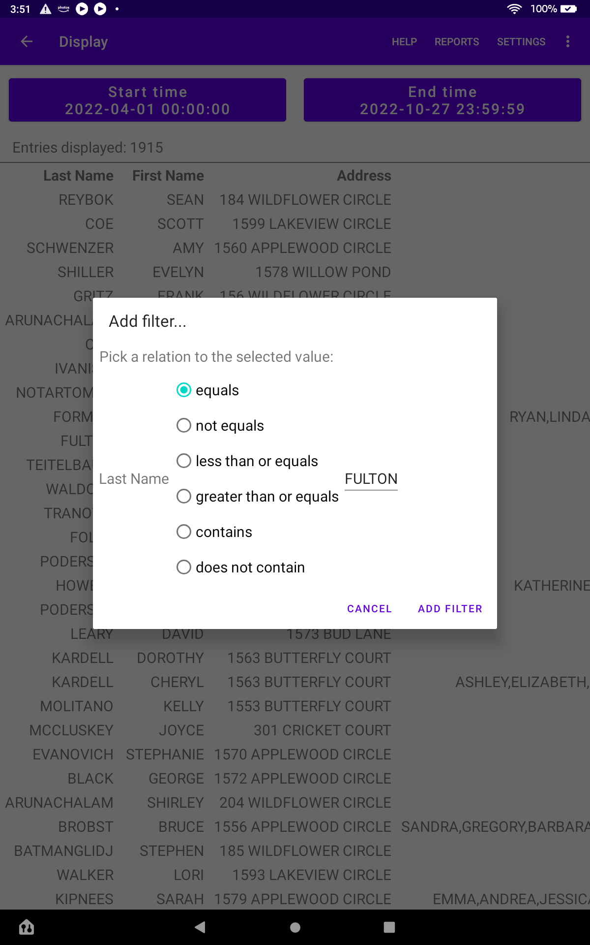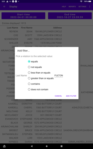 The Display page allows data displayed to be filtered and analyzed. Touching (long press) a value in the table will pop up a panel that will allow setting of filters. Adding a filter will constrain the displayed entries. Multiple filters can be added and they act collectively (with an AND). The filters are displayed on the line above the table. Pressing on a filter description will cause the filter to be displayed so that it can be modified or deleted.
