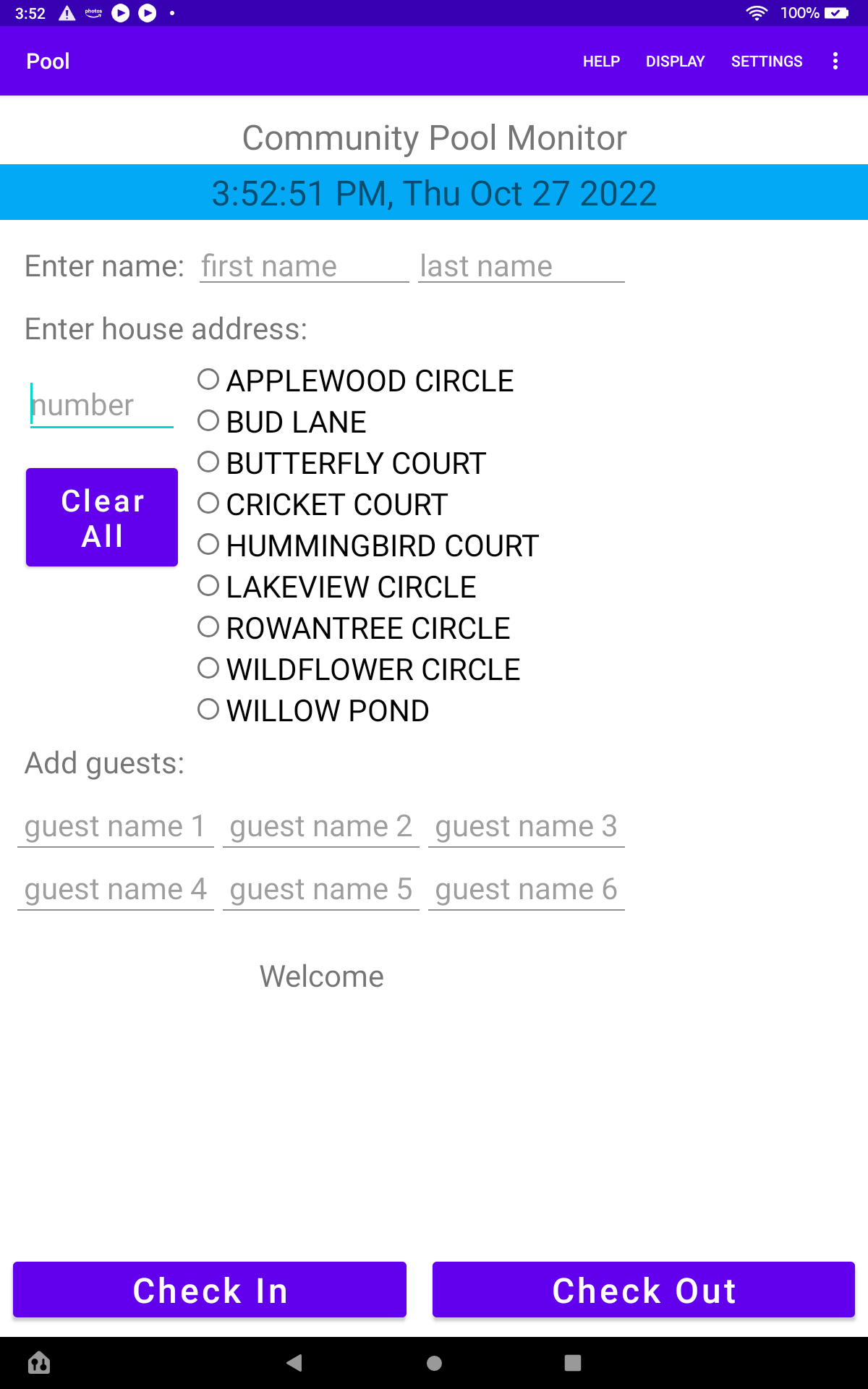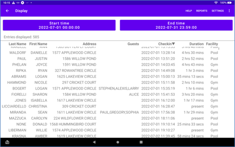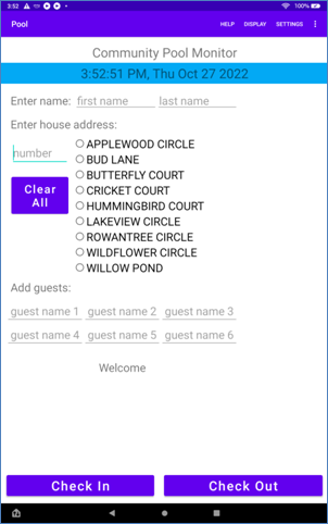 A community owned tablet can be placed at the entrance to the facility, like at the life guard position at a pool. Members will not need to install this app. On arriving at the pool, the Life Guard will assist members to 'Check In' by entering their home address and last name into the tablet. The app maintains a list of all valid addresses in the community and the authorized members living there. The member is validated if the last name they entered matches the names on record for that address. For convenience, only the first 4 characters of a last name need to be entered. The street name can be easily selected. Photographs of members can help identify them. The Life Guard will also 'Check Out' members as they leave. Up to 6 guest names can be entered.